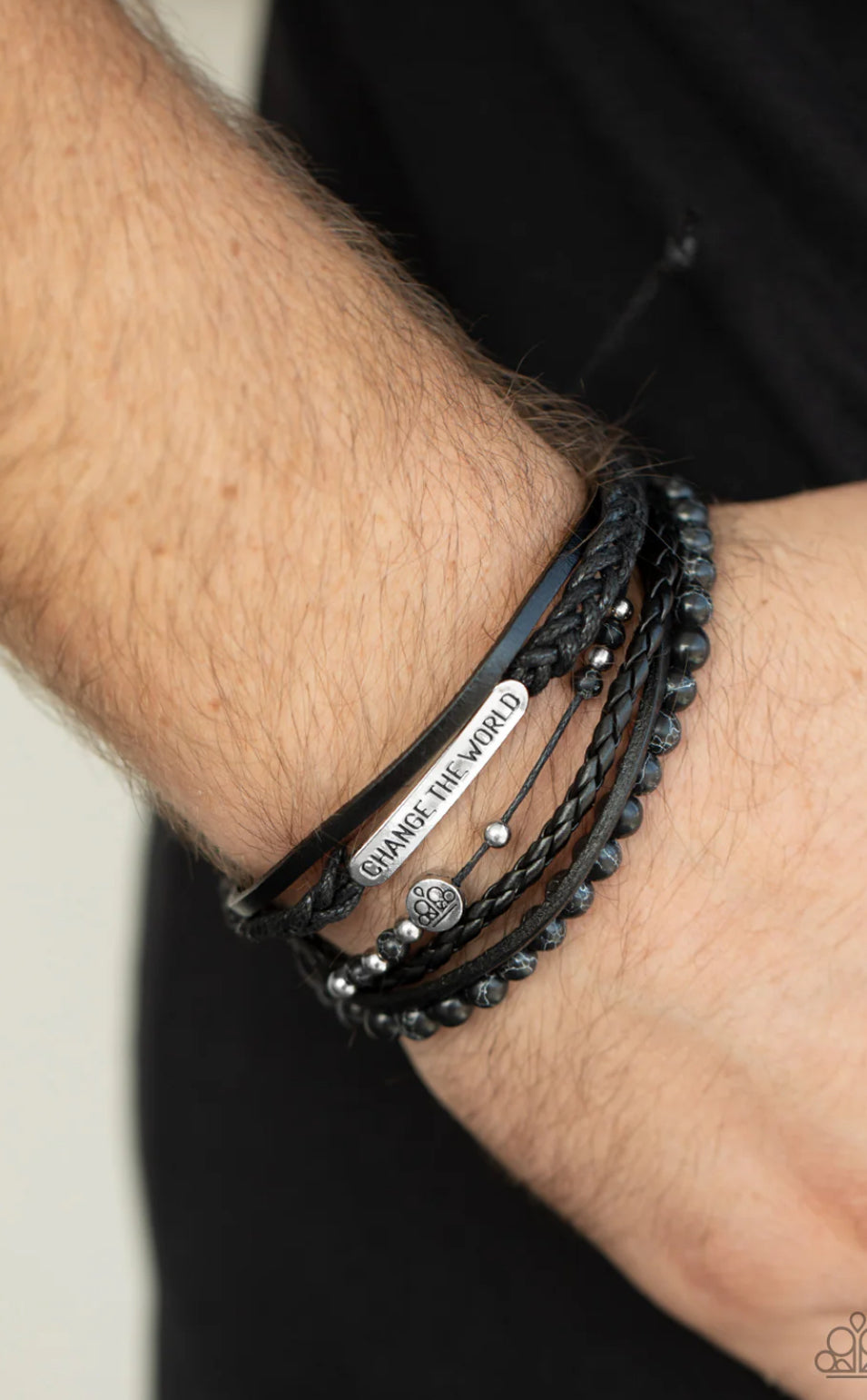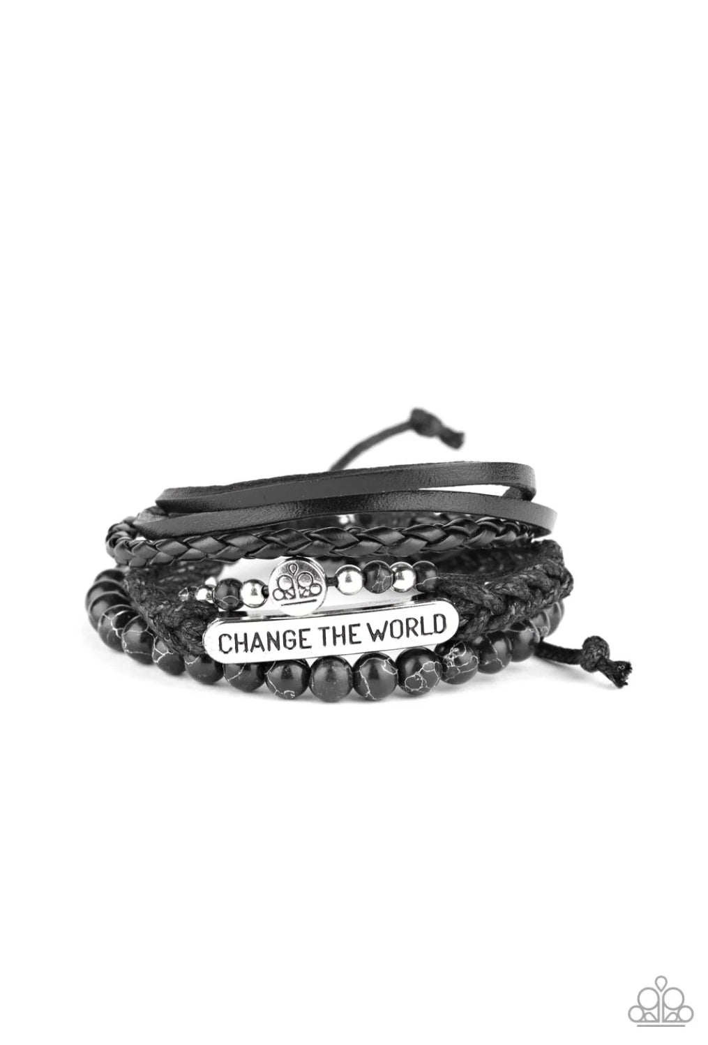 Infused with sections of glassy black stone beads, a dainty Paparazzi crown charm, shiny silver beads, and a silver frame stamped in the phrase, "Change The World", mismatched strands of straight and braided bands stack across the wrist. Features an adjustable sliding knot closure.