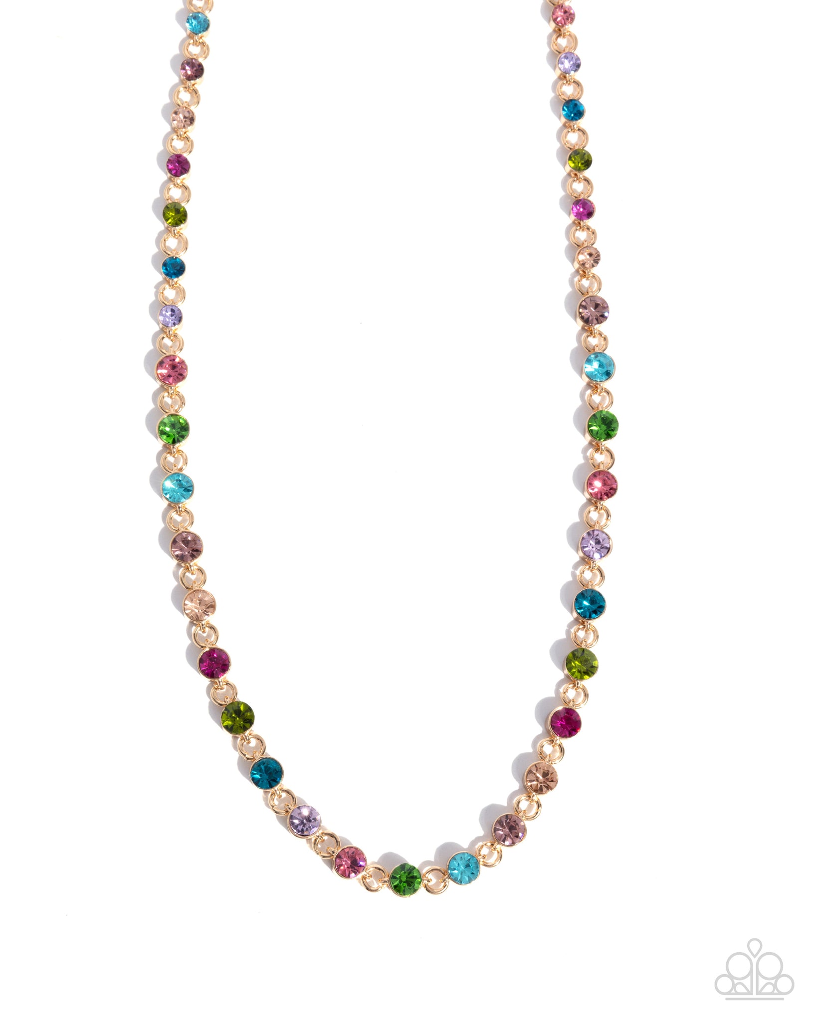 Spanning around the entirety of the neckline, a refined collection of multicolored rhinestones is pressed into glistening round gold frames, alternating with gold rings, accentuating their charismatic sparkle. Features an adjustable clasp closure.