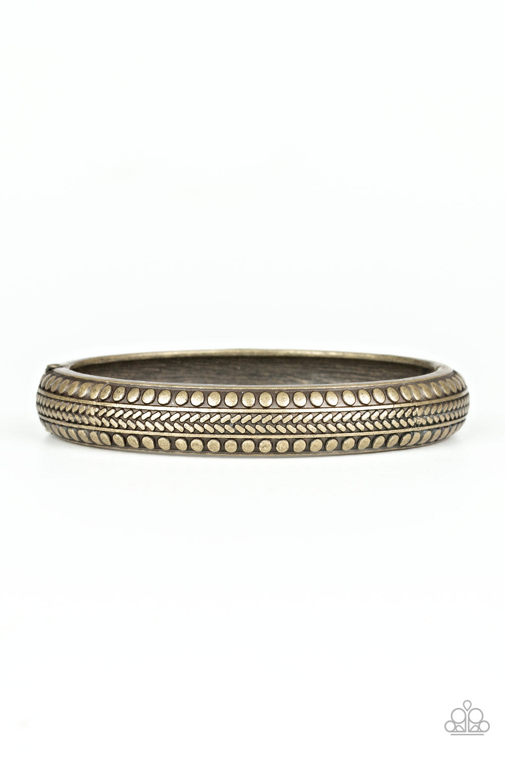 Flanked by rows of flat brass studs, a chevron-like pattern is embossed down the center of a thick bangle-like cuff for a tribal inspired look. Features a hinged closure.